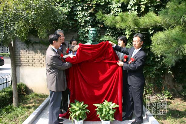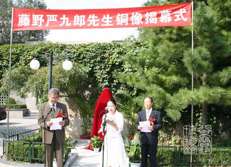 日本驻华使馆新闻文化中心主任道上尚史在揭幕式上致辞,并代为宣读了日本国外务大臣町村信孝的贺词。日本国外务大臣町村信孝在贺词中指出:“描述鲁迅和藤野严九郎亲密交往的作品——《藤野先生》,以一个介绍日本人和中国人通过心与心交流而结成至交的美丽逸事,广泛地为日中两国所熟知。……我期待,以此次半身像设立为契机,宛如二人那样超越国籍、民族界限的人与人的交流今后能够日趋增大,日中两国间的相互理解和友好合作得到进一步发展。”