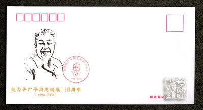 鲁迅夫人,著名作家和社会活动家许广平先生历任政务院副秘书长、全国人大常委、全国政协常委、“民进”中央副主席、全国妇联副主席等职务。上海鲁迅纪念馆为纪念许广平同志诞辰110周年,特制纪念封一枚。