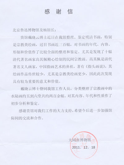 北京鲁迅博物馆副研究员戴晓云博士应大同博物馆邀请,整理鉴定其馆藏明清书画,特别是宗教画。