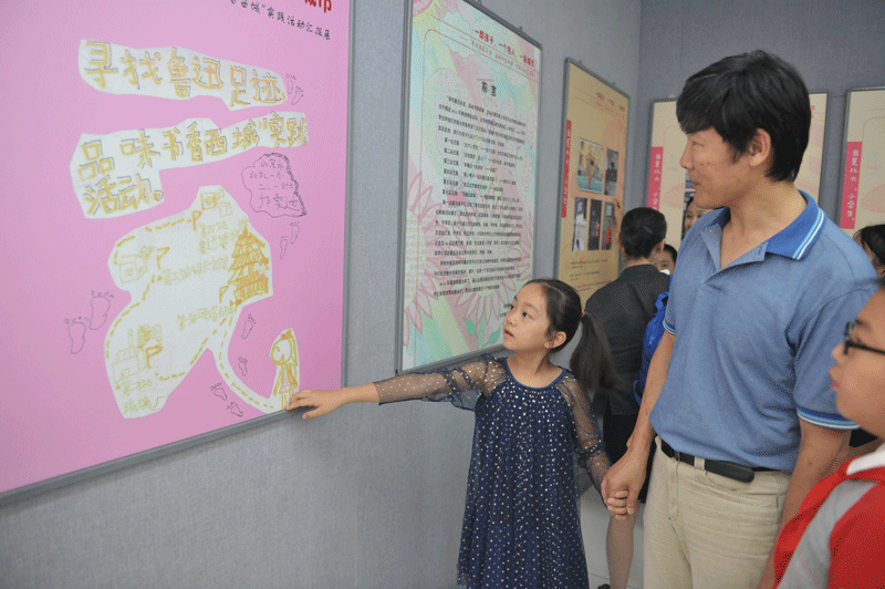 在这次展览中,所有的展览说明均摘自孩子们行走记录册中的语言,所有的画面也均来自孩子们纪念册中拍摄的照片、图片——这是一个完全由孩子的视角主导的展览。因此,展览开幕式也完全围绕孩子展开。进步小学张卜心同学、奋斗小学蒋翊峥同学的纪录片开启了这个特殊的开幕式;北青社区报西直门小记者站的小记者对参加活动的文化小使者的现场采访:当小记者们问李圣一同学为什么一定要让姥姥在砖塔之前拍照时,李圣一同学回答说:“参加寻访活动一路都是姥姥给我拍照片,因为这座砖塔叫‘万松老人塔’,我就觉得一定要给姥姥拍照片,祝她健康长寿。”刘雨菲同学在纪念册里号称的“比鲁迅帅多了”的爸爸也终于在采访中亮相。雨菲爸爸风趣的说:“前一段股市大跌心情很差,可是参加这个活动、观看这个展览却给了我惊喜,平时不要说孩子,就是大人也经常围着电脑、手机这样的电子产品转,很少读书。通过我带着孩子参加这次活动,到鲁迅的足迹地寻访,找资料、查书、拍照片,让我们大人和孩子一起有了一次亲近书籍、亲近伟人的机会,也让我们通过寻访伟人的足迹更了解这个城市??吹秸估乐械哪谌荩⒆用腔幕?、写的文章比我们大人还棒,真是非??模?rdquo;采访仪式后,孩子和家长们与领导老师一起,在展览的最后一个版面——“鲁迅足迹,一路有我”签名墙上签名,为这个特殊的展览画上完美的句号。