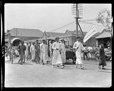 4、总统府前抗议甘博有3张照片记录了6月28日的请愿活动。据报载,6月27日下午1点左右,山东请愿团、北京中等以上学校学生联合会代表请愿团、京师总商会、在京的留日学生、报界、基督教、陕西学生联合会等各界人士四五百人,手执旗帜,来到总统府(新华门)请愿。各界推出代表7人,向总统提出“不要在欧洲和约签字”等三项要求。但从中午到下午,一直未得到总统接见。晚上11点,代理内阁总理龚心湛才接见各界代表,他表示会向总统汇报,劝各代表散去,但各代表坚持表示要见总统,于是代表留宿颐年堂,其余请愿人员,主要为学生,露宿于新华门外。直到次日上午9时,总统徐世昌才接见了请愿团代表,表示已电令外交总长陆征祥切实保留山东权利,否则不签字,谈话进行了将近两小时,在得到龚声明政府定竭尽全力后代表才出来向学生报告。但学生仍未散去。此时天津代表赶到北京,与北京代表合在一处。当晚六点徐世昌接见天津代表,再次表示山东问题持保留主义,座谈一小时,代表始出。到晚上八点,所有代表和学生才散去。[11]当时媒体报道请愿学生有150余人,包括两名女生,他们在新华门前停留三十个小时,仅食面包及汽水少许。[12]