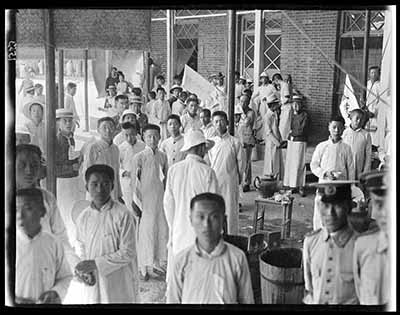 3、临时监狱情况学生被监禁后,遭到社会各界严正抗议。他们认为学生如犯罪可依法处置,但大学则为国家机关,不能无故占领作为囹圄,受到非法侵犯。此外,民众最关心的就是学生在监狱的生活,尤其是吃饭睡觉问题。据报载,京师警察厅开始没有为如此多的学生准备饮食。监禁第一日,学生们只能食粥一碗。各校教职员不忍学生挨饿,捐款购买馒头、面包送给学生。学生因饥饿而病者不乏其人。后京师警察厅请各校为学生准备食物,才有十余车面包运到北大法科。学生有被褥铺盖,是家属送来的。[10]甘博拍摄了学生临时监禁处北大法科内、外部照片7张,包括北大法科的食堂、大讲堂、教室、操场等(图20-22)。可以看到学生们睡在由桌椅组成的临时床铺上,可读书看报,自由活动。