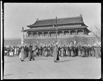 甘博有7张照片记录了1919年11月29日北京学生在天安门前集会抗议示威的情景(图26-28),甘博没能拍下1919年5月4日当天学生集会的场景,我们完全可以通过这些照片感受到五四当天的情况,除了衣着,其他都是非常类似的。