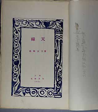 《绿天》一出版,苏雪林很快就送给了鲁迅。在扉页上用黑色钢笔写了:“鲁迅先生校正学生苏雪林谨赠七、四、一九二八”。版权页的留印处还加盖了“绿漪”朱红印章。不过现在鲁迅博物馆的这部“鲁迅藏书”,毛边,却没有裁开,似乎鲁迅没有读过。实际上“鲁迅藏书”中另有一本,也是毛边,却裁开了,翻过了。是鲁迅特意为保存赠书的原貌,另买来一部阅读呢,还是在苏雪林赠书前就买了一本来阅读了?如果是前者,可见鲁迅对这本书的珍重;是后者,又可见鲁迅关注这本书的热情,因为从书的出版到苏雪林赠书,时间不到一个月。