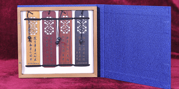 本品采用黑檀、酸枝、花梨及楠木制作,一套四枚,雕刻鲁迅《自嘲》诗一首:“灵台无计逃神矢,风雨如磐暗故园。寄意寒星荃不察,我以我血荐轩辕?!北酒纺静拿?,木盒蓝布套包装,制作精良高雅,诚为上等礼品。本品由北京鲁迅博物馆监制。