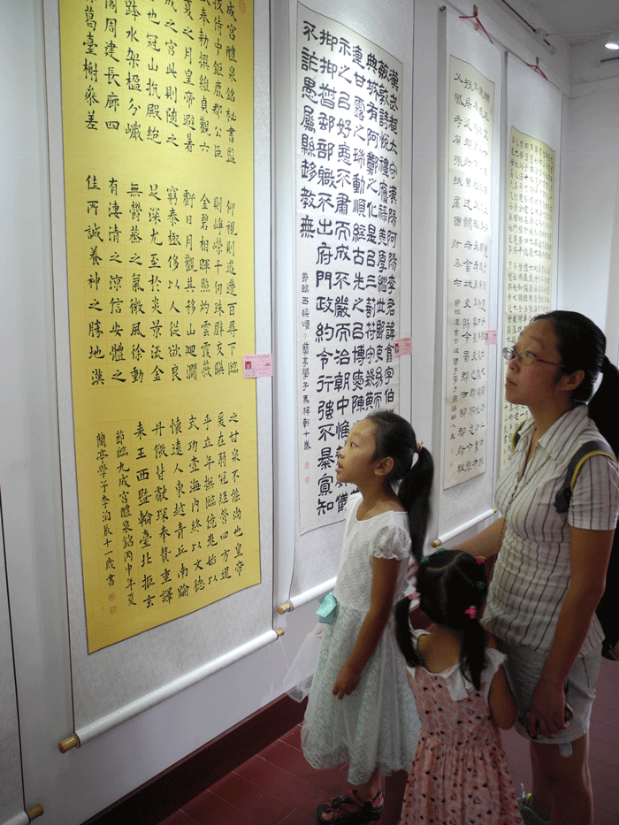 参展的100余幅临帖作品均出自于保定兰亭书法学校就读的中小学生和部分已考入高校的大学生及教师的作品。同学们怀着对祖国传统书法的挚爱,用手中的笔饱蘸浓墨,临摹着殷商甲骨、两周金文、秦篆汉隶、简牍帛书、魏晋法帖、北碑唐楷、宋元手札、明清墨迹等68种历代经典碑帖,篆隶楷行草五体兼备。