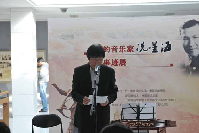 10月26日,由广州市番禺区文化广电新闻出版局、番禺博物馆(冼星海纪念馆)、北京鲁迅博物馆(北京新文化运动纪念馆)联合主办的“人民的音乐家——冼星海生平事迹巡回展”开幕式在北京鲁迅博物馆举办。由北京鲁迅博物馆(北京新文化运动纪念馆)党委书记、副馆长李游,国际博协副主席、中国博物馆协会副理事长兼秘书长、北京鲁迅博物馆(北京新文化运动纪念馆)副馆长安来顺,广州市番禺区文化广电新闻出版局副调研员赵国华,广州市番禺区文物管理委员会办公室主任、番禺博物馆、冼星海纪念馆馆长曾昭明,副馆长李柏涛等有关领导和来自北京市西城区金融街街道民康社区的代表出席开幕式??皇接砂怖此惩局鞒?。