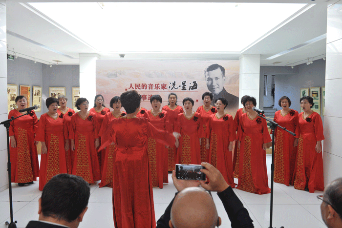 为配合展览开幕,主办方还邀请了北京银海民族管弦乐团现场演奏冼星海的经典作品《保卫黄河》《在太行山上》《到敌人后方去》《夜半歌声》,把观众的思绪带入到哪烽火连天的抗战岁月;西城区金融街社区合唱团演唱了《黄水谣》、《保卫黄河》等歌曲,把开幕式推向了高潮。