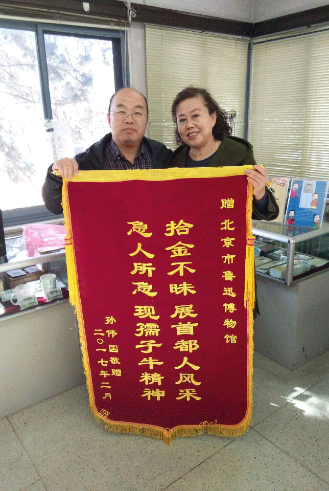 2月19日上午,北京观众孙伟国来我馆参观,在纪念品商店购买纪念品时不慎将钱包遗失在柜台上。北京鲁博文化中心武素云同志拾到后,及时向该中心领导报告。经清点,钱包内许多重要证件及现金,后经保卫处与驻地派出所取得联系,通过身份证上的信息联系到了失主。2月22日出差在外的孙伟国观众委托其爱人来馆领取钱包。又于2月26日专程来馆,向我馆赠送“拾金不昧展首都人风采;急人所急现孺子牛精神”锦旗。