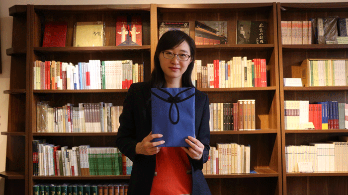 刘欣和她为法兰克福文具展设计的中国风书衣。新华社 隋先凯 摄