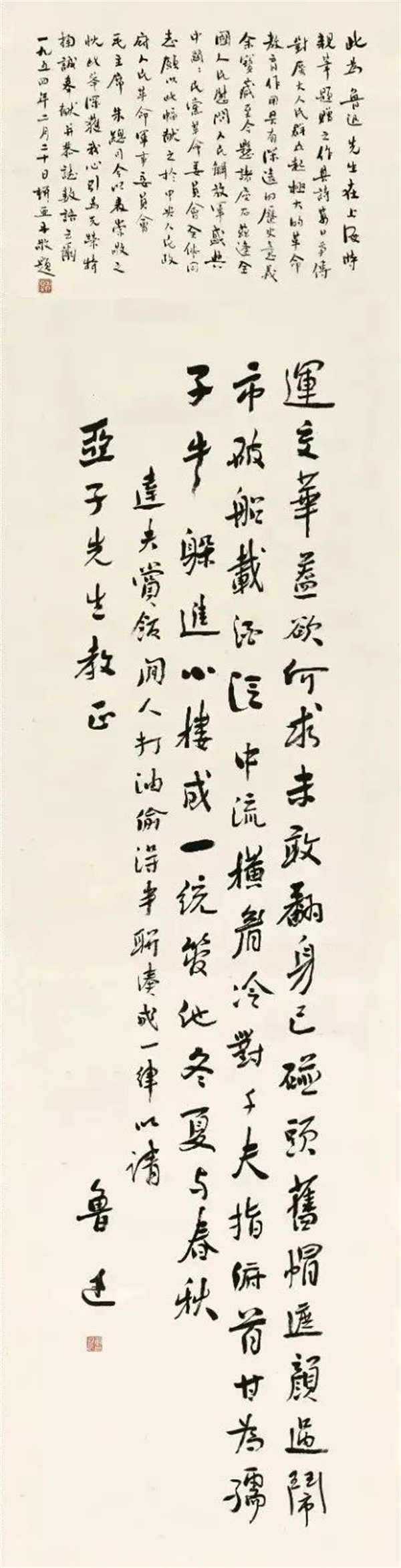 这两个王瑶学术文献展,分别于今年5月7日与6月11日开幕。二展共享基本框架,但依据各自收藏及展厅情况,略有变化,其中也不无互相竞争的意味。先是文学馆的展览获得好评,我不敢怠慢,6月8日下午提前查看北大校史馆的布展情况。展板还没完全就绪,但基本面貌已经出来了,我逐个审核图片及说明,与策展人商量修改方案。突然间,我看到工人刚取回的装好镜框的鲁迅《自嘲》诗手迹,感觉有点异样,直觉是此条幅比文学馆的修长。赶紧拿出手机,查看现代文学馆展厅中的虚拟客厅,那边鲁迅《自嘲》诗手迹是四行,而这边是三行(不算题跋及落款)。这到底是怎么回事,为何同一幅字,排列方式不一样?这可让我惊出了一身冷汗。