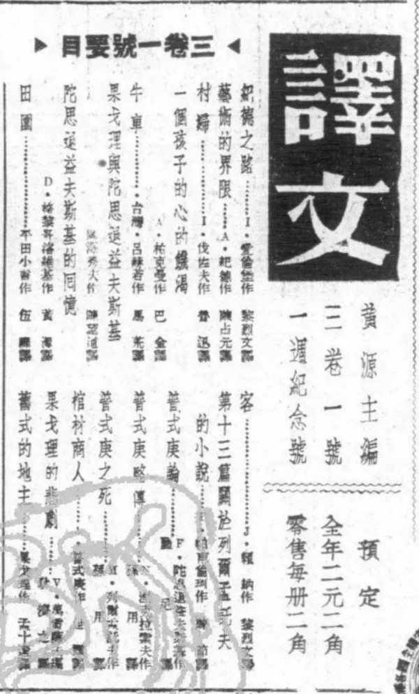鲁迅本着对读者负责的态度为《译文》规划译稿,努力维护、提升《译文》在文学翻译界的声誉。按计划,《译文》第三卷第一期将在1935年9月发行,原本《一周年纪念号》却成为《终刊号》。16日,鲁迅告诉黄源:“顷见《申报》,则《译文》三卷一期目录,已经登出,上云‘要目’,则刊物出来后,比‘要目’少了不少,倒是很不好的”[77]?!渡瓯ā吩じ娴?ldquo;三卷一号要目”共计16篇,《终刊号》刊登了预告“要目”中的12篇,其中4篇未能如期刊登,分别是巴金译A·柏克曼《一个孩子的心的饥渴》、黄源译D·格黎哥洛维基《陀思退益夫斯基的回忆》、伍禅译平田小六《田园》、孟十还译果戈理《旧式的地主》[78]?!吨湛拧沸略龌浦右隠·修史《无耻的柯拉》。最终《终刊号》呈现给读者的是13篇,尚不至“少了不少”,影响也不至于“很不好”。