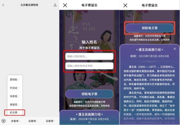 关注我馆微信公众号,点击左下角“来鲁博”栏目中的“电子票”(电子票已正式上线),输入姓名及身份证号即可获取“潘玉良画展”专属电子票及屏保一套(共四张)。